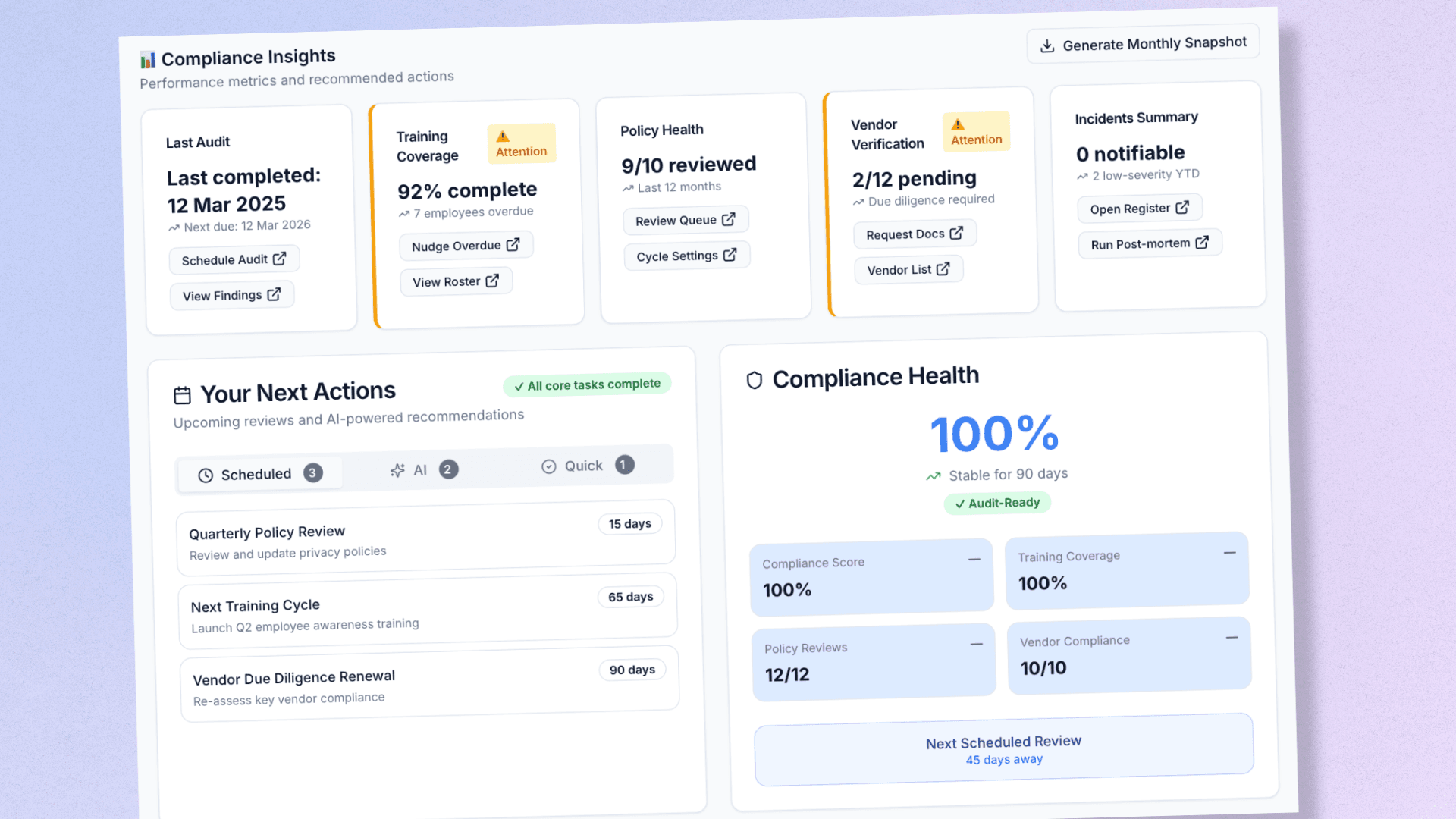 Every policy acknowledgment timestamped. Every incident documented. Every training completed. One-click audit reports that make regulators happy.