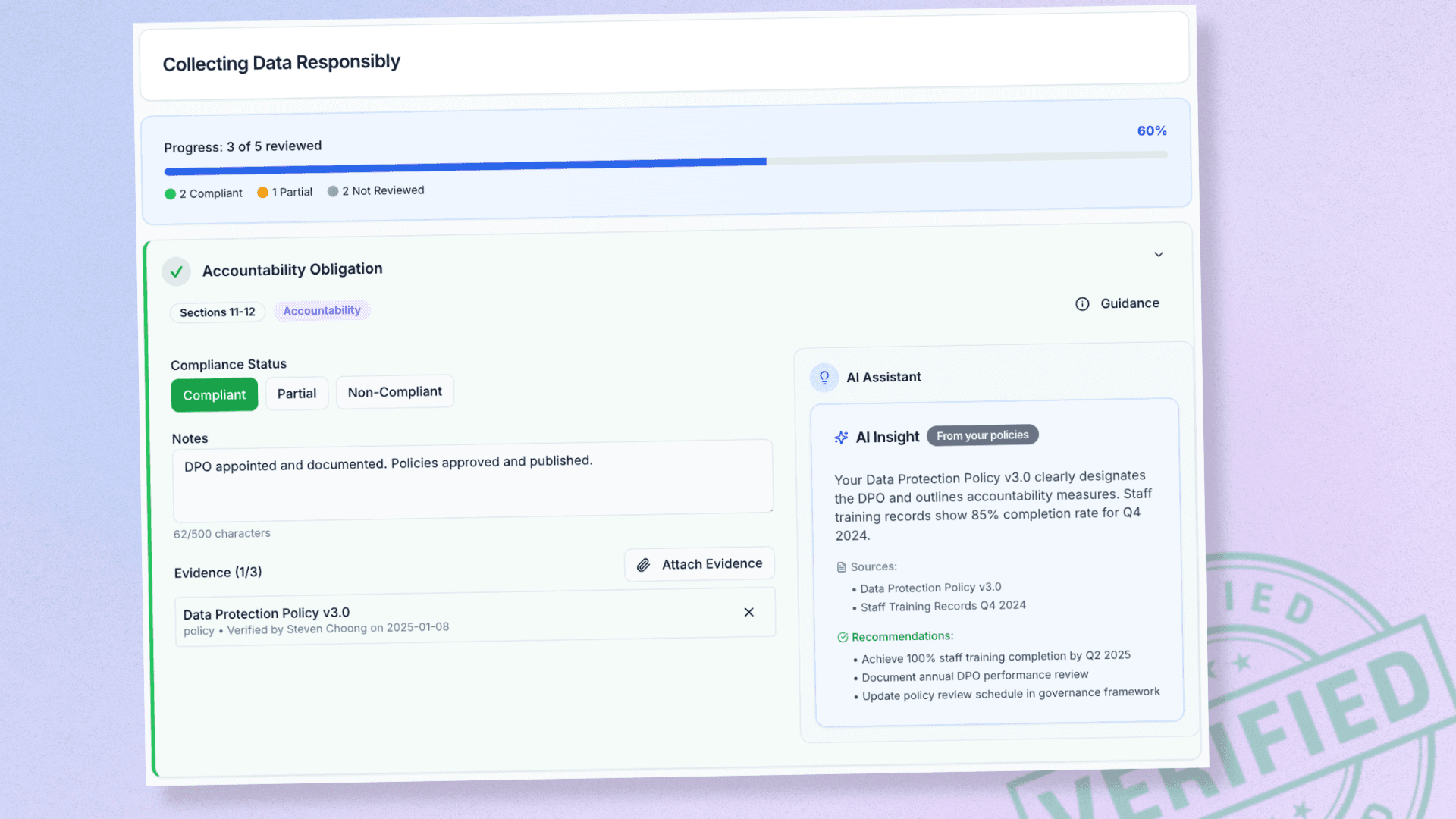 Every policy, training, and incident is automatically captured, timestamped, and linked to the correct PDPA obligation.